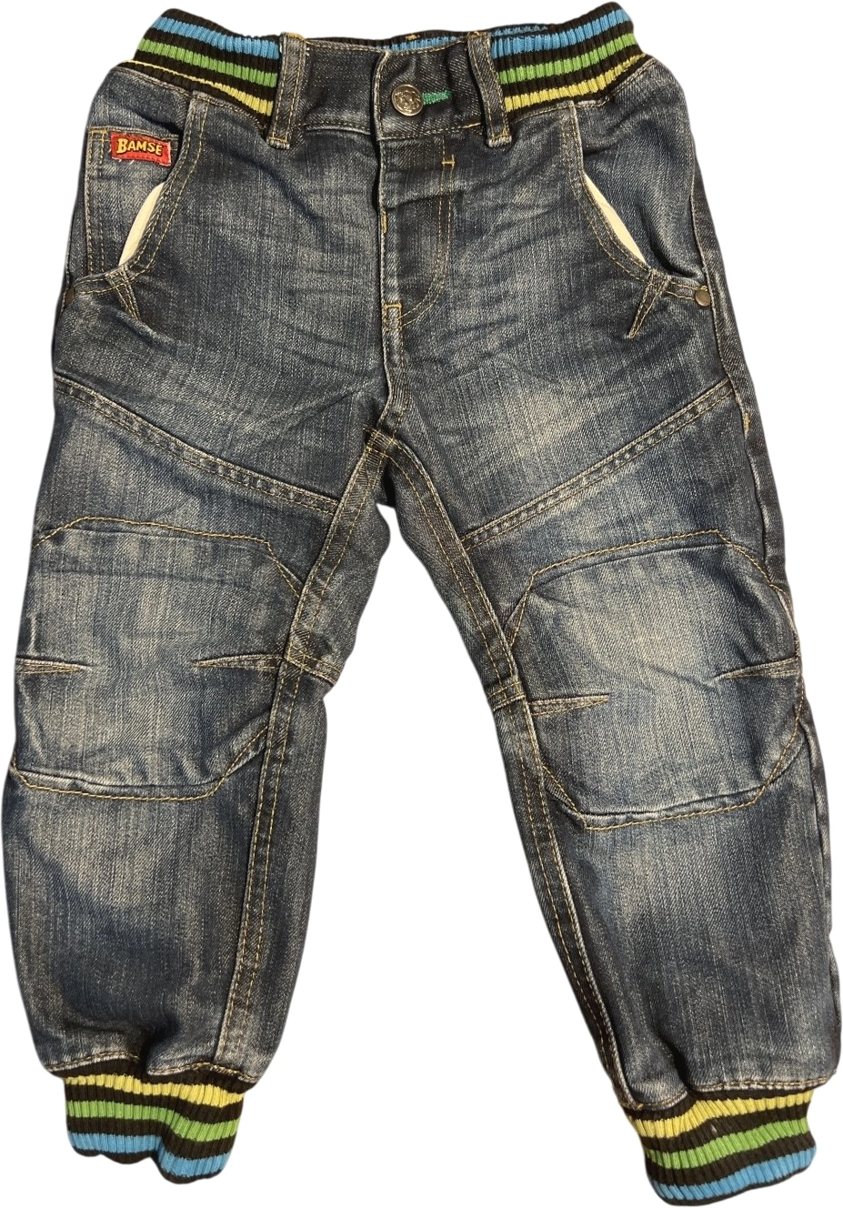 Stilige bukser i blå denim med fargerike detaljer i livet. Komfortabel passform og slitesterkt materiale gjør disse perfekte for hverdagens eventyr. Praktiske lommer gir det lille ekstra.