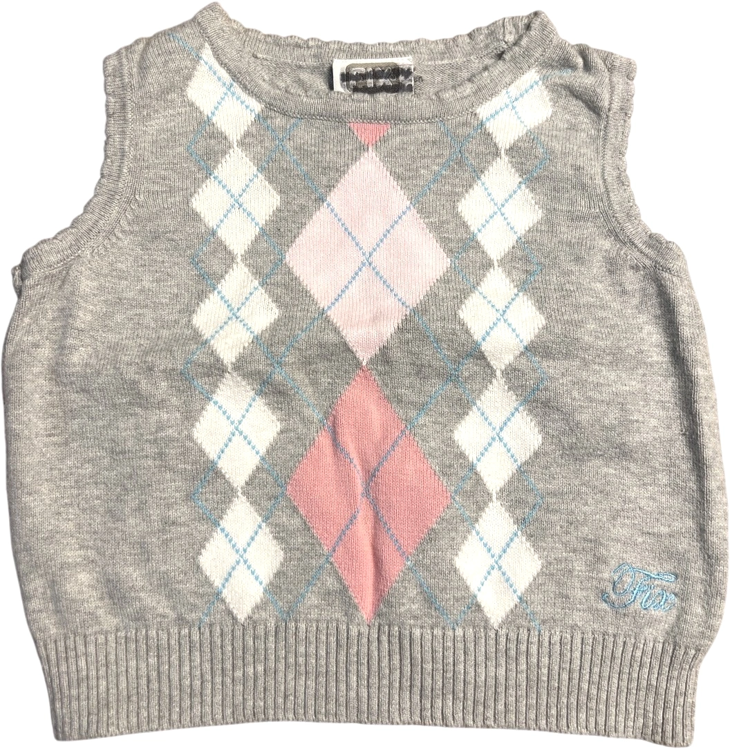 Lett, ermeløs genser med et klassisk argyle-mønster i rosa, blått og hvitt mot en grå bakgrunn. Mykt materiale for komfort hele dagen.