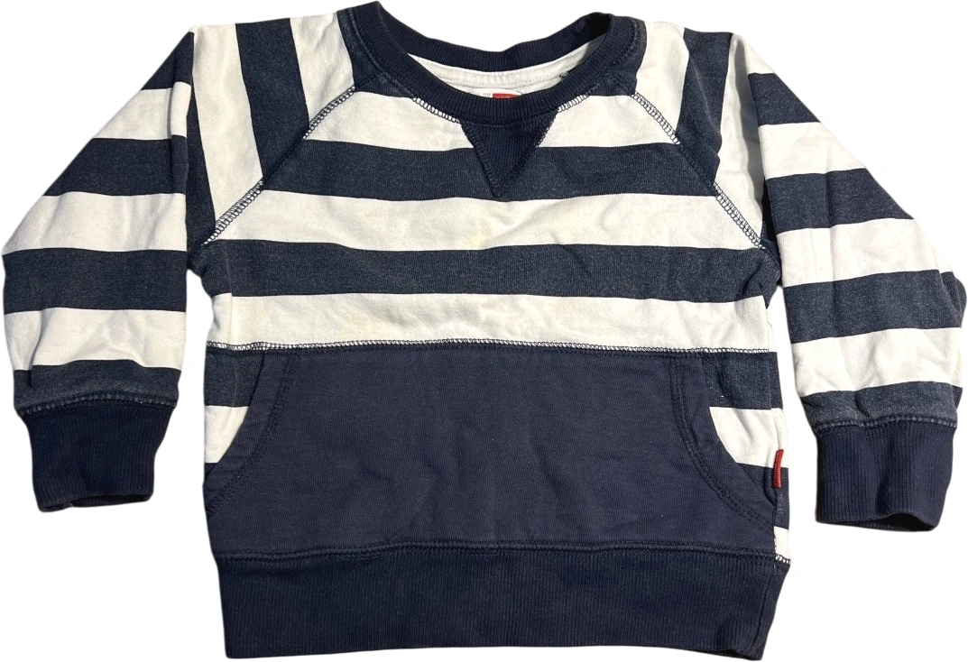 Langermet stripete genser i marineblå og hvit med ribbestrikkede kanter. Mykt materiale gjør den komfortabel for daglig bruk.