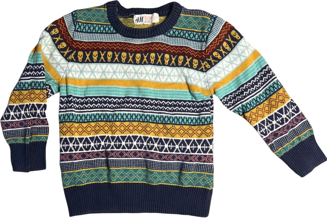 Fargerik genser med mønstret design som gir et unikt preg. Stoffet har en kombinasjon av varme farger som gir liv til antrekket. Den er brukt lite og har ingen synlige tegn på slitasje.