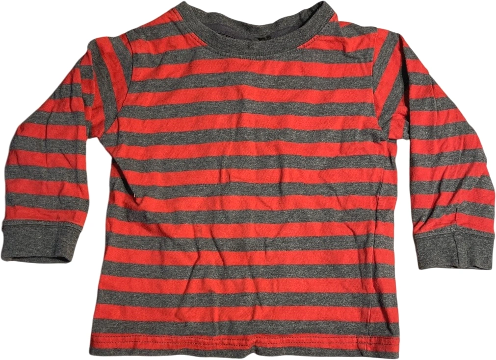 Langermet genser med et klassisk stripete mønster i rødt og grått. Mykt og komfortabelt stoff gjør den ideell for daglig bruk.