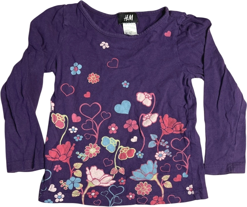 Langermet genser i lilla med et blomster- og hjertemotiv i flere farger. Stoffet er godt brukt, men fortsatt mykt og komfortabelt.