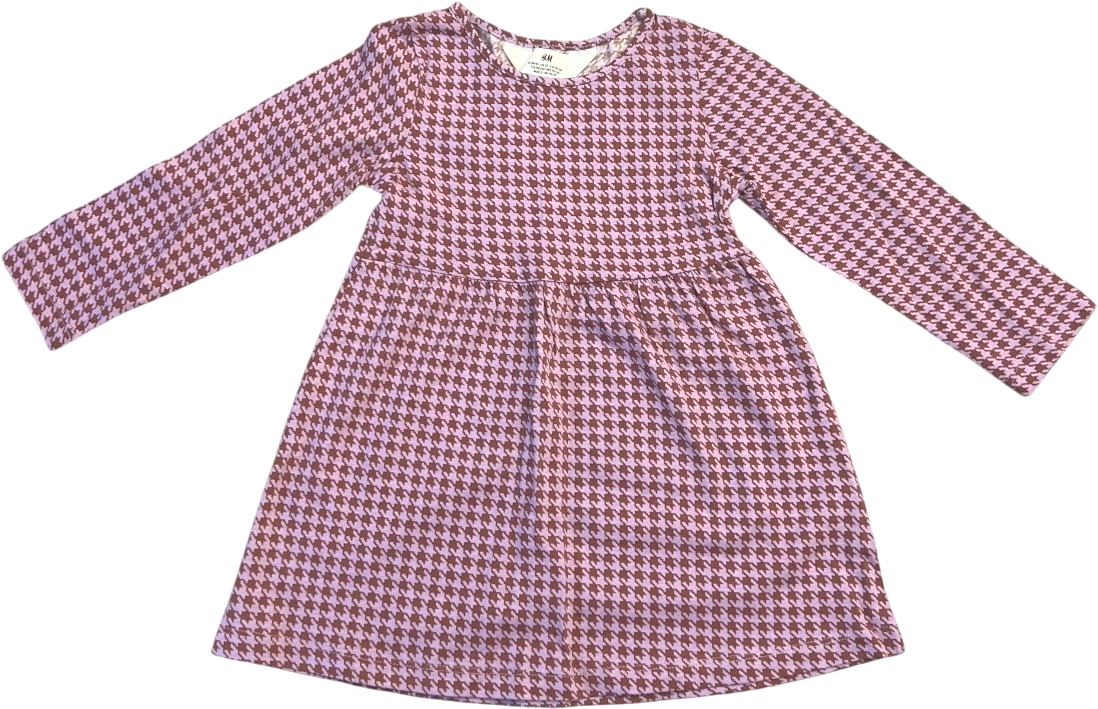 Kjole med et moderne mønster i rødbrun fargetone. Lange ermer og rund hals gir et klassisk utseende. Plagget er i utmerket stand og perfekt for enhver anledning.