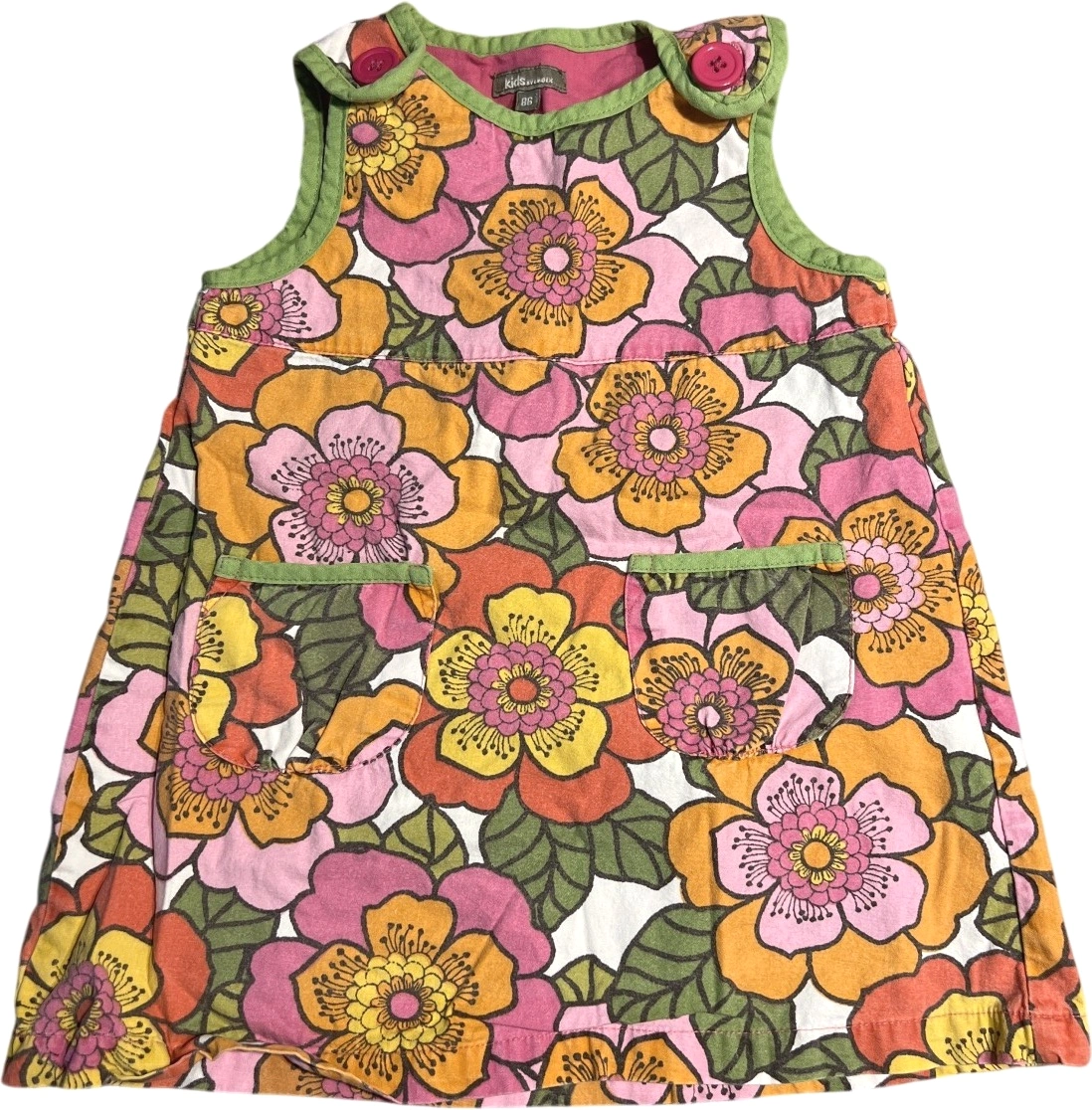 En fargerik kjole med et livlig blomstertrykk i rosa, oransje og grønt. Kjolen er ermeløs med to store knapper ved skuldrene, og har praktiske lommer foran. Passer perfekt for de som ønsker en fargeglad stil.
